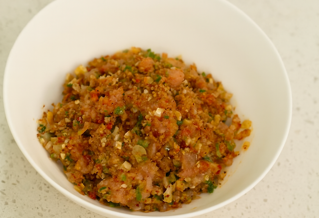 ▶ 볼에 명란, 파, 고추, 다진 마늘을 넣고 섞어 주세요.
