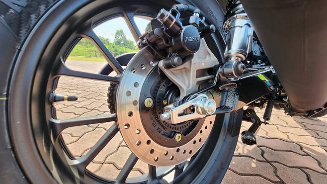 브레이크를 과하다 싶을만큼 강하게 잡아도 잠기거나 미끄러지지 않고 제동반응을 이어갔다. 직경 310mm와 240mm 디스크 브레이크가 앞뒤로 적용됐고, 2채널 ABS가 있어 더 안정감 있게 제동을 할 수 있었다. 혼다 셀렉터블 토크 컨트롤(HSTC)은 거칠고 미끄러운 노면에서 리어 휠이 미끄러질 때 엔진 연료 분사량을 조절해 엔진 토크를 제어한다.