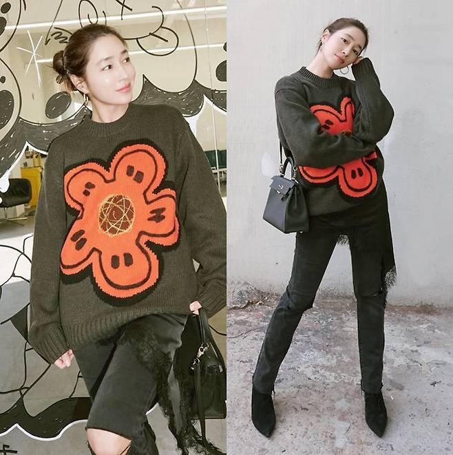 공개한 사진에서 이민정은 무릎이 찢어진 스키니 바지에 커다란 해바라기 캐릭터가 수놓아진 니트 스웨터를 입고 깔끔하게 뒤로 묶은 헤어 스타일로 걸리시한 동안 미모를 발산했다.