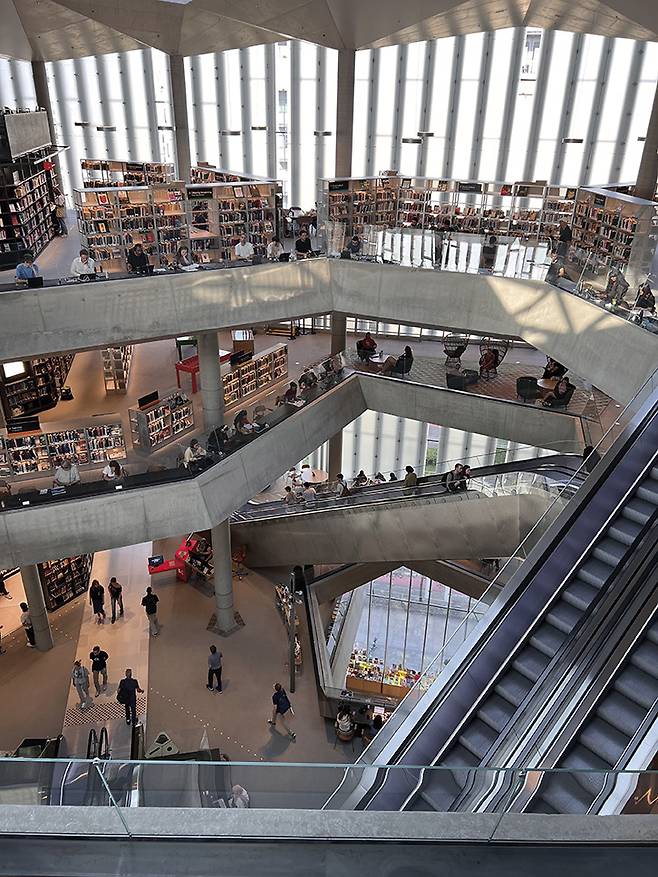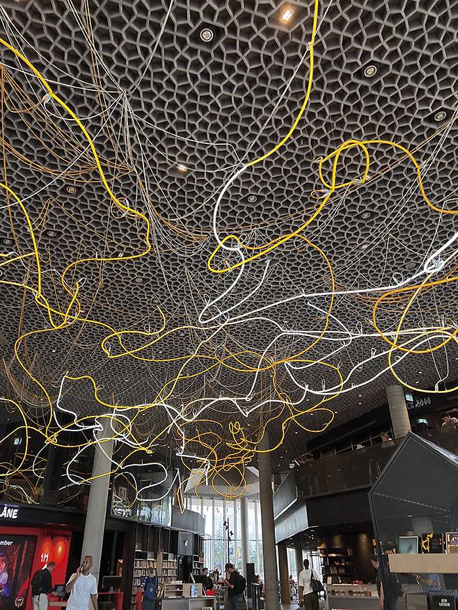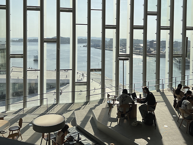 “여기 데이크만 비에르비카 오슬로 공립 도서관 맞나요?” 입구에 들어서자마자 안내 데스크로 향해 던진 질문이다. 우선 노르웨이 현대 예술가 라스 외 람베르그(Lars Ø Ramberg)의 작품인 400미터 길이의 네온 튜브 <브레인스톰(Brainstorm)>이 시선을 압도하고, 그 흔한 가방 검사 한번 없이 에스컬레이터를 이용해 유유히 전층을 이용할 수 있다. 현대적이면서도 창의적인 건축 방식이나 부담스럽지 않게 상상력을 자극하는 예술 작품, 오페라 하우스를 내려다보며 일몰을 감상할 수 있는 통창까지 둘러보고 나면 절로 오슬로 시민들이 부러워진다.