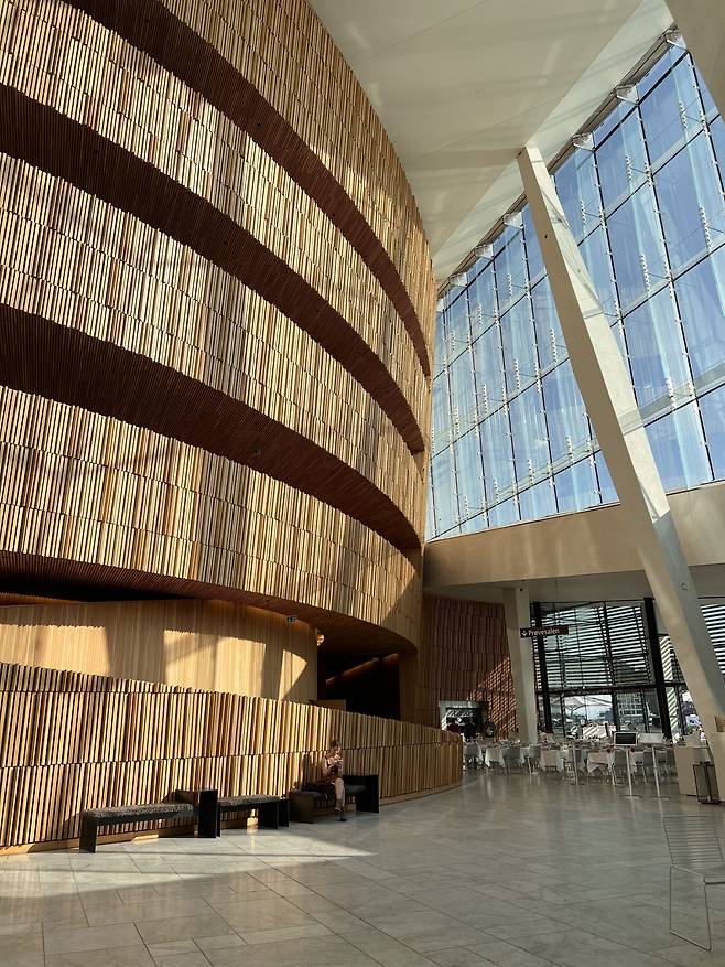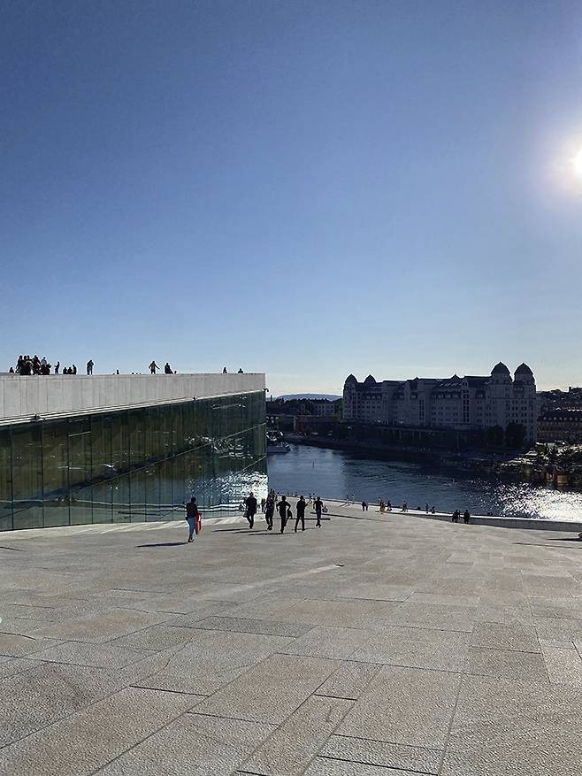 언뜻 보면 피오르에 정박해 있는 페리 같은 오슬로 오페라하우스는 주변 환경과 완벽하게 어우러진다. 위험을 경고하는 문구나 펜스 하나 없이 경사지게 설계된 대리석 패널이 피오르에서 건물 입구로 이어지며 안으로 들어가지 않아도 외부의 대리석을 따라 올라가면 곧장 뷰 포인트로 연결되어 전망을 감상할 수 있다. 그 대리석 패널 위에서 뛰노는 아이들, 책을 읽거나 일광욕을 즐기는 시민들을 보고 있으면 해방감이 들면서 오페라에 조금 더 가까워지는 기분이 든다. 대리석, 유리, 나무를 주요 소재로 사용한 이 건물은 노르웨이의 건축 회사 스노헤타의 작품이다.