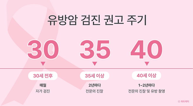 20년만에 6.5세가 높아진 셈이죠. 유방암 진단 연령이 높아지고 있지만, 조기 발견이 중요한 만큼 젊은 연령대부터 정기적인 검진을 받는 것이 필요합니다. 아래 유방암 검진 권고 주기를 확인하고, 시기별로 유방 건강을 관리하세요.