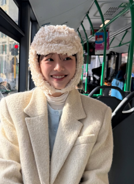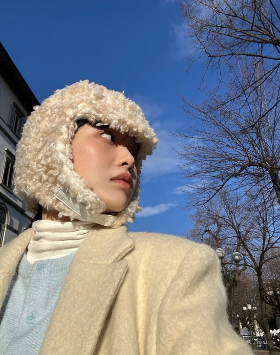 복슬복슬한 양털 모자와의 조합은 그녀의 사랑스러운 매력을 한층 더 돋보이게 했답니다. 츄가 선택한 이 자켓은 여성 디자이너 브랜드 오버듀플레어의 코지 울 자켓으로