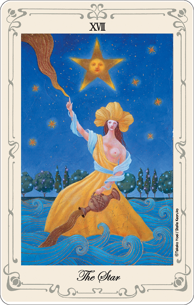 ‘별’카드는 소원성취를 시사합니다. 하지만 그 성공은 쉽게 손에 넣을 수 없습니다. 이른바 ‘별’은 꿈을 향해 나아가는 상태를 의미하지만, 희망은 있으나 어중간한 상태라 할 수 있기 때문입니다. 카드는 ‘커다란 꿈을 품고 이상적인 비전을 그린다면 나아가야 할 길이 보이게 될 것’이란 메시지를 보내고 있습니다. 또한 꿈을 달성할 때까지는 수많은 사람들의 협력을 얻어야 합니다. 즉, 이 카드는 모두가 협력하는 것의 중요함을 의미하고 있는 것입니다.