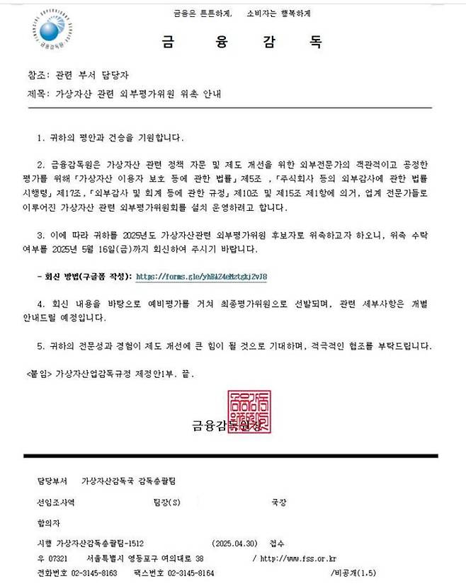 금융감독원 직원을 사칭해 가상자산 관련 외부평가위원을 위촉한다며 개인정보를 요구하는 메일이 발견돼 금감원이 주의를 당부했다.