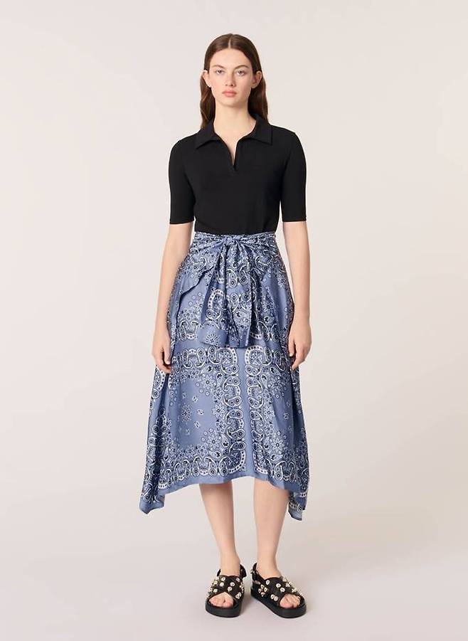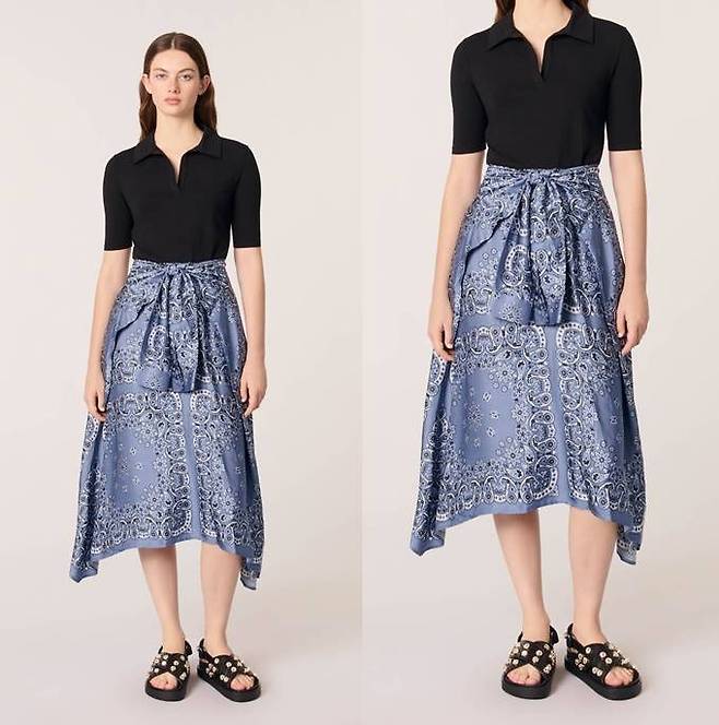 프렌치 컨템포러리 브랜드 '마쥬(MAJE)'의 반다나 트롱프뢰유 드레스는 니트 탑과 새틴 느낌의 프린트 스커트를 따로 입은듯한 효과를 연출, 여름 휴양지 특유의 생기와 활기를 더한다.
