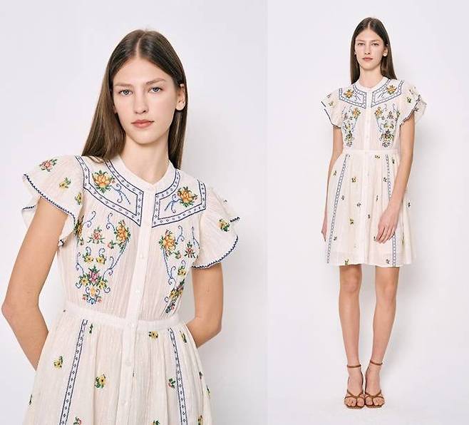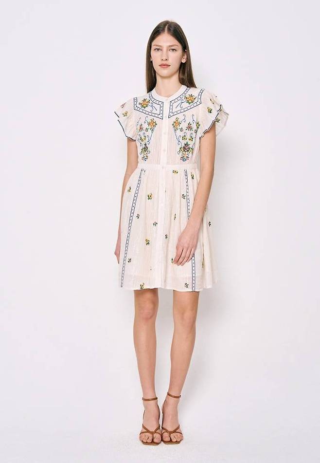 프렌치 컨템포러리 브랜드 '베르니스(BERENICE)'의 플라워 자수 미니 원피스는 섬세한 플로럴 자수 디테일이 돋보이는 우아하면서도 발랄한 분위기를 선사한다.