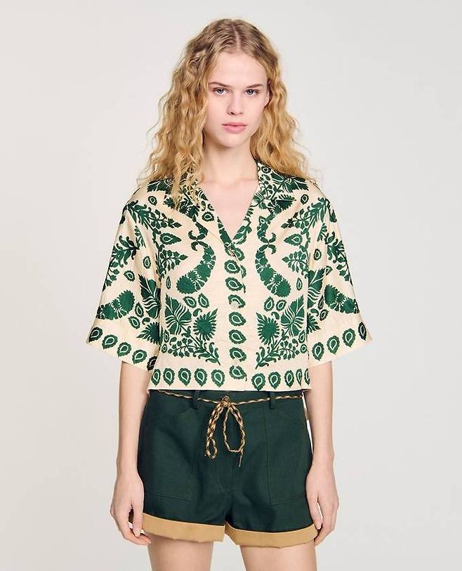 프렌치 컨템포러리 브랜드 산드로(SANDRO)'의 플로럴 프린트 반팔 셔츠는 새틴 소재를 사용해 청량감을 높였으며 고급스러운 패턴 프린트와 감각적인 컬러 구성으로 인해 도심 속 데이웨어로도 활용할 수 있다.