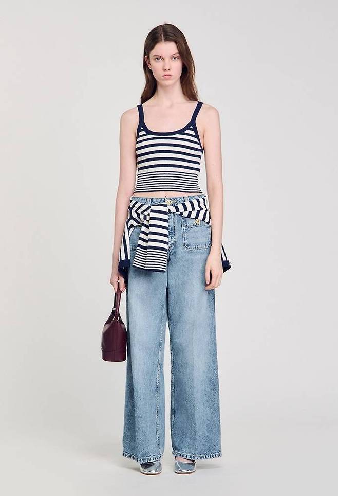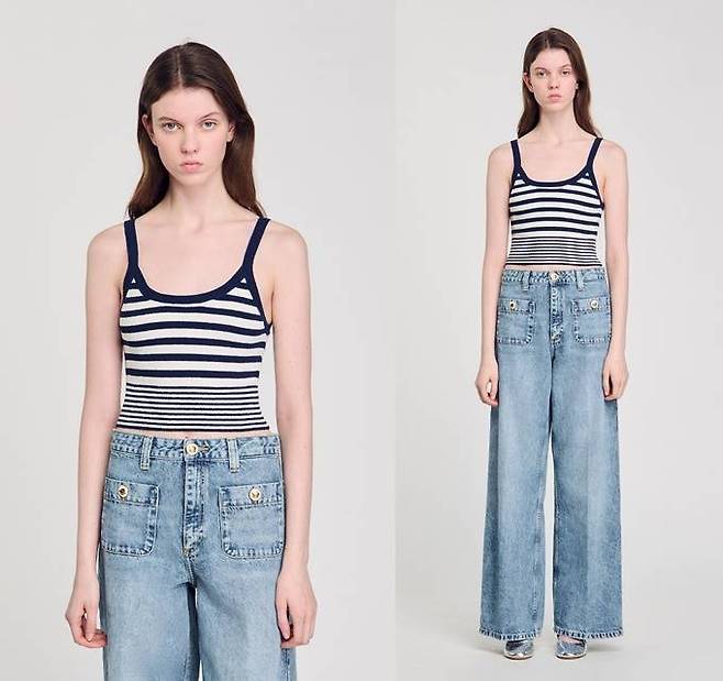 프렌치 컨템포러리 브랜드 '산드로(SANDRO)의 니트 탑은 스트라이프 패턴의 테리 소재 아이템으로 산뜻하면서도 자유로운 분위기를 선사한다.