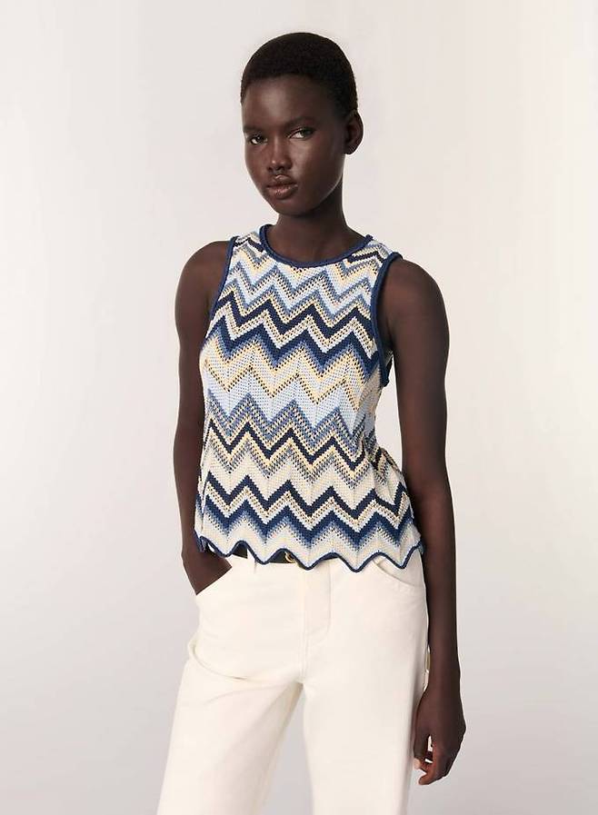프렌치 컨템포러리 브랜드 '마쥬(MAJE)'의 크로셰 니트 탑은 은은한 반짝임이 느껴지는 기하학적인 헤링본 패턴이 특징이며 스캘럽 형태의 밑단은 우아한 분위기를 연출한다.