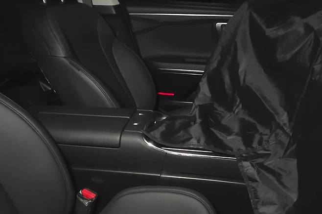 실내로 넘어가면 크래시패드의 변경은 아직 알 수 없다. 크래시패드엔 위장막이 덮여 있어 아직은 변경 지점을 유추할 수 없는 부분이다. 추측하자면 공조기 패널 정도에는 변경이 있지 않을까 하는 예상은 해볼 수 있겠다. 그 외 부분은 위장막에 덮여있지 않아 확인할 수 있는 정보가 있는데, 우선 도어 트림이 바뀐다. 현행 그랜저 GN7은 도어 내캐치가 검은색으로 마감됐지만, 페이스리프트 모델은 팰리세이드 LX3와 아이오닉 9 ME1 또는 싼타페 MX5의 그것처럼 은색으로 마감되고 형태도 그들과 비슷해졌다.