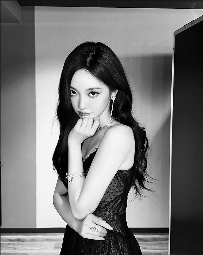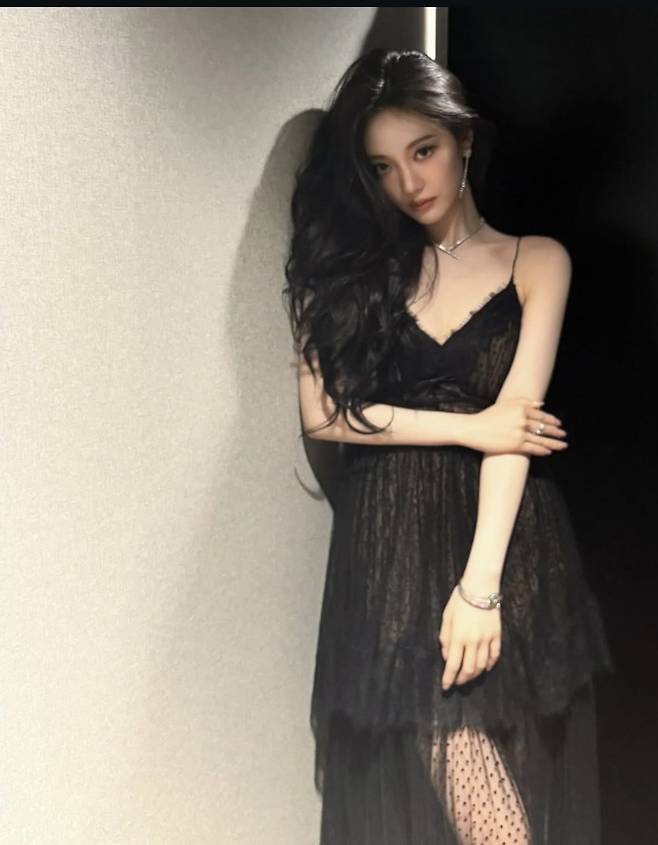 닝닝은 얇은 끈이 돋보이는 시스루 원피스로 고혹미를 더했습니다.