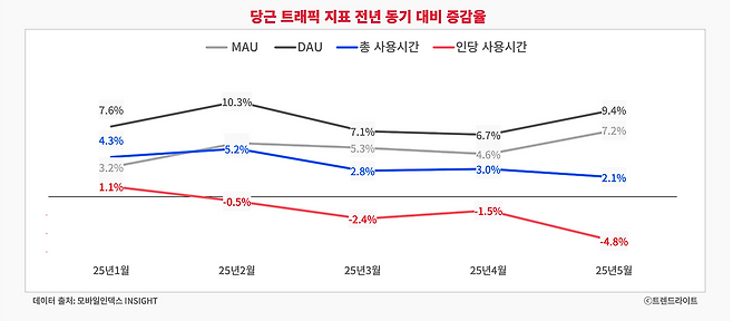 그런데 올해 들어 DAU는 물론, 정체되었던 MAU마저 증가하는 반면, 사용 시간 성장세는 오히려 더딥니다. 인당 사용 시간은 오히려 전년 대비 하락했죠. 신규 사용자 유입에 따른 일시적인 현상일 수도 있지만요. 추가적인 사용자 규모 성장이 제한적인 상황에서 사용성까지 정체되는 건 분명 위협적인 신호입니다.