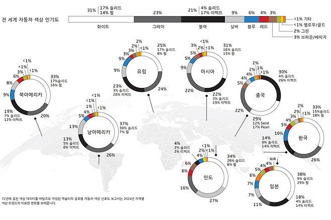글로벌 색상 인기도를 살펴보면 흰색이 31%, 회색이 23%, 검은색이 21%, 은색이 9%이며, 그 이후 유채색은 파란색, 빨간색, 갈색, 초록색, 노란색 순으로 선호도가 나타났다. 대륙별로 살펴보면 아시아는 흰색, 검은색, 회색 순으로 선호도가 높은 반면, 나머지 대륙에서는 흰색, 회색, 검은색 순으로 높았으며, 아시아 국가 중에서 중국만은 흰색이 아닌 검은색의 인기가 가장 높다. 또한 특이하게 북미는 은색이 파란색보다 낮다.