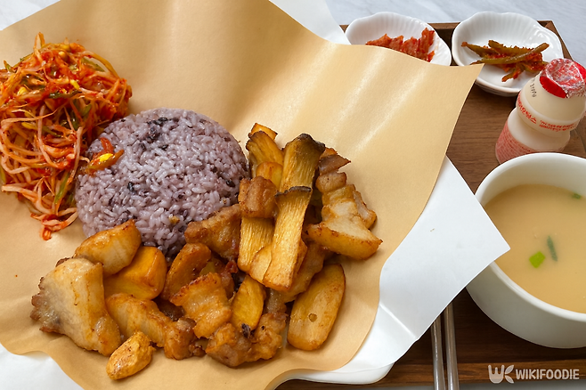 메뉴 구성은 삼겹살 구이, 항정살 구이, 찹스테이크, 참치마요덮밥이 중심이다. 고기를 주문하면 밥 위에 고기와 함께 파채, 콩나물무침이 곁들여 올라가 푸짐하다. 기본으로 국과 반찬이 나오고, 식사 마무리로 요구르트까지 제공돼 알차게 한 끼를 즐길 수 있다. 삼겹살 구이는 기름기가 적당히 빠져 담백하고, 항정살 구이는 쫄깃하면서도 고소하다.