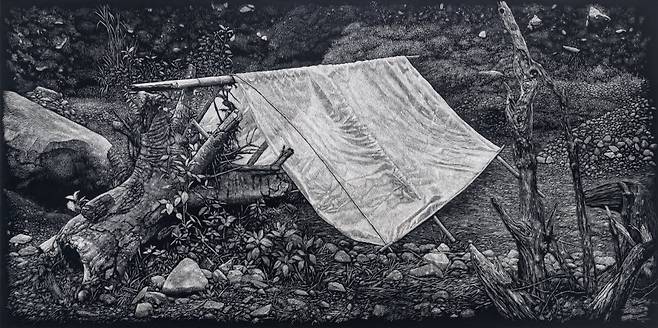 마리안토의 고국인 인도네시아는 세계에서 세 번째로 큰 열대 우림을 비롯해 천혜의 자연환경을 보유했지만 난개발로 국토 곳곳이 급속히 황폐화하고 있는 나라다. 그는 이런 실태를 고발하기 위해 독특한 기법을 쓴다. 전공인 판화를 응용해 캔버스 전체를 검정 아크릴로 덮은 후 표면을 긁어내는 것. 그 과정은 마치 눈앞의 이익을 위해 외면한 자연 파괴 모습을 그림으로 불러내 상기시키는 것 같다.
