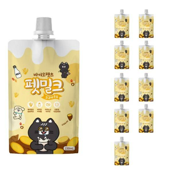 고구마 맛이 나는 펫밀크예요. 고양이가 펫밀크를 마시면 자연스럽게 음수량이 늘어 좋고, 우유껌이나 푸딩으로도 활용하기에 좋답니다.