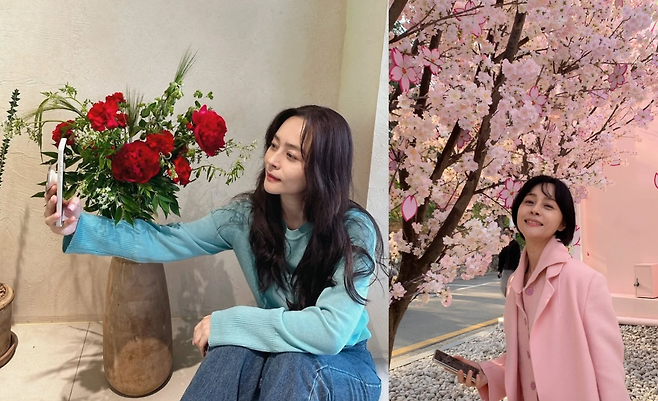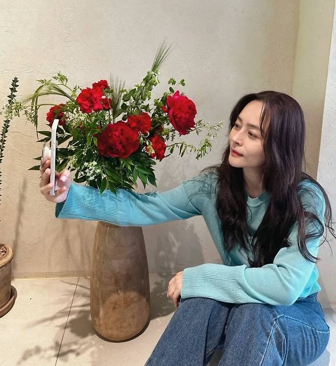 우희진은 연한 민트색 니트와 데님 팬츠를 조합한 편안한 일상복으로 자연스러운 매력을 연출하고 있다. 특히 오버사이즈 니트의 여유로운 실루엣이 편안함을 강조하며, 빨간 꽃다발을 들고 있는 모습에서 따뜻한 봄 분위기를 자아내고 있다. 셀카를 찍는 자연스러운 포즈와 함께 일상 속 소소한 행복을 표현하는 스타일링을 보여주고 있다.