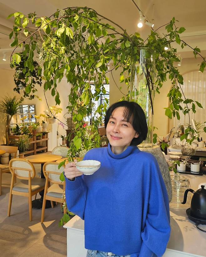 식물이 우거진 카페에서 우희진은 선명한 블루 니트로 포인트를 준 스타일링을 선보이고 있다. 오버사이즈 니트의 여유로운 핏과 밝은 블루 컬러가 활기찬 에너지를 전달하며, 차를 마시는 일상적인 순간에서도 세련된 패션 감각을 드러내고 있다. 자연스러운 헤어스타일과 함께 편안하면서도 스타일리시한 룩을 완성하고 있다.