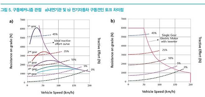 내연기관 자동차의 엔진의 경우에는 구동에 필요한 토크의 회전속도 대비 크기가 <그림 5>의 a)와 같이 제한되는 특징으로 엔진만으로 구동할 수 없기 때문에, 회전수에서는 손해를 보더라도 구동 부하를 극복하기 위하여 변속기가 반드시 적용되어야 한다. 그러나 전기자동차의 구동 모터는 전압과 주파수를 동시에 제어하는 인버터와 종감속 기어만을 사용하여도 자동차의 구동에 필요한 이상적인 견인 구동 토크를 구현할 수 있다.