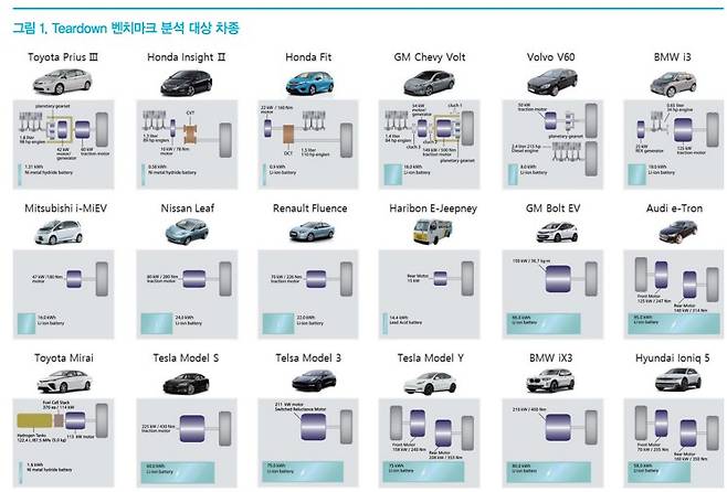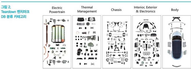 전기동력 자동차는 Teardown 벤치마크 분석을 통하여 시스템 단위부터 크게 전동 파워트레인, 열관리, 섀시, 내외장 및 차체로 구분하여 모듈, 부품 및 소재 단위까지 분석을 진행하였다. Teardown 벤치마크 분석 정보의 기술적 의미를 정확하게 해석하기 위하여 차대 동력계를 활용하여 MCT(Multi-Cycle Test) 모드 주행 1충전 주행거리 평가, 급속 및 완속 충전 성능 평가를 병행하여 현재까지 출시된 글로벌 완성차 메이커의 전기동력 자동차의 기술 수준을 분석하였다.