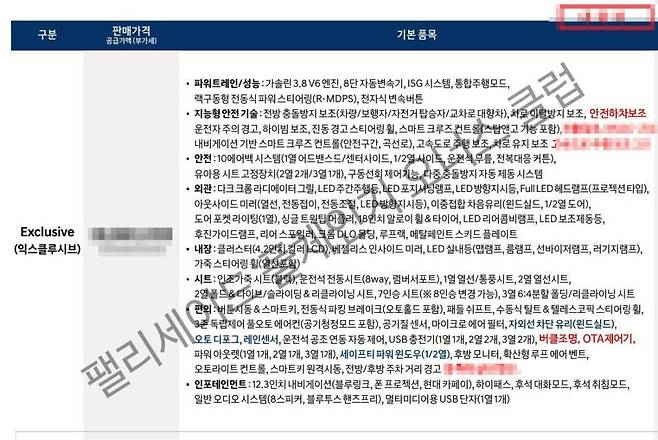 한편, 최근에는 팰리세이드 풀체인지(LX3)를 기다리는 소비자들의 관심을 끌 수 있을 것으로 생각되는데 기존 팰리세이드 트림 구성 중 가장 낮은 트림 구성인 익스클루시브 트림 사양을 기준으로 구성된 팰리세이드 풀체인지(LX3) 익스클루시브 트림 사양이 일부 공개가 되었는데 새로워진 팰리세이드 풀체인지 익스클루시브 트림 구성에는 새로운 옵션 사양이 추가되었고 그 외 추가적인 옵션 사양이 기재가 되어 있으나, 무슨 이유인지는 알 수 없지만 해당 부분은 가려져 있어 추가적인 내용 공개를 할 것으로 암시하고 있습니다.
