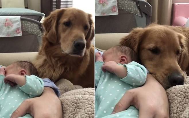 겨우 잠든 아기가 혹시라도 깰까봐 걱정됐던 엄마 집사는 강아지를 향해 "쉿!"이라고 말했습니다. 그러자 골든 리트리버 강아지가 이렇게 반응을 보여 감동을 안겼죠.