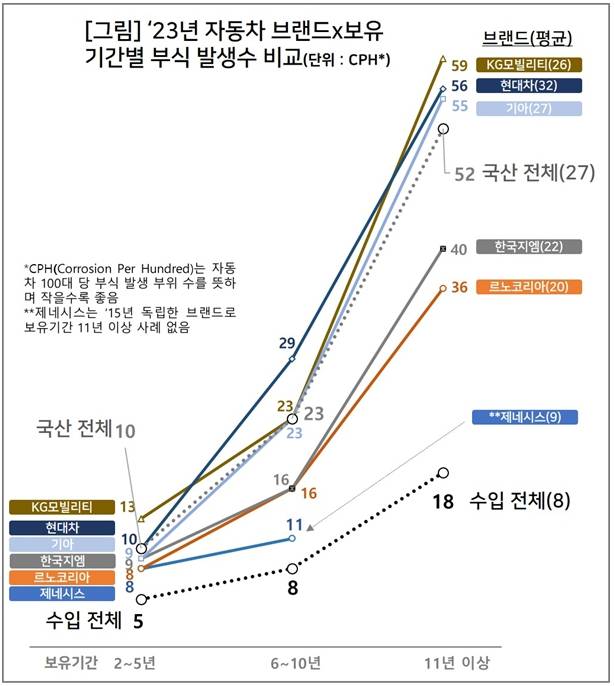 현대차에 이어 기아는 27CPH로 두 번째로 많았고, KG모빌리티(26CPH), 한국GM(22CPH), 르노코리아(20CPH) 등의 순으로 뒤를 이었다. 제네시스는 9CPH로 국산 브랜드 중 가장 낮았으나 독립 브랜드 출범(2015년) 후 11년 이상 된 차가 없어 직접 비교는 불가능했다.