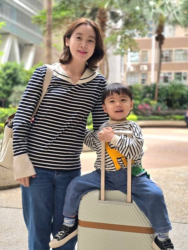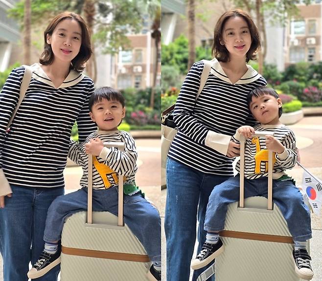 공개한 사진에서 우혜림과 개구쟁이 아들 시우는 똑같이 데님 팬츠에 스트라이프 티셔츠를 걸친 트윈 커플룩으로 캐주얼하면서도 편안한 여행 스타일을 선보였다.