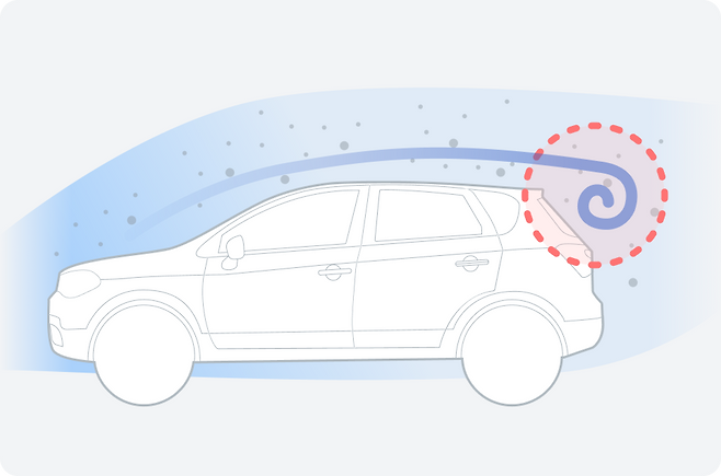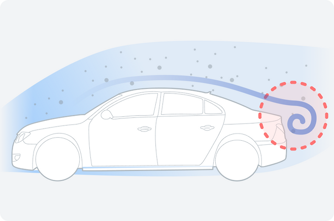 주행 중인 자동차는 공기를 가르며 앞으로 나아갑니다. 그리고 갈라진 공기는 자동차의 상하좌우 면을 타고 흘러가는데요. 이때, 자동차의 뒤쪽은 공기의 흐름이 끊기며 순간적으로 압력이 낮아지게 됩니다.