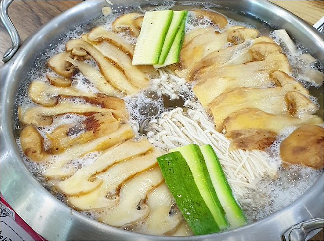 이곳의 송이버섯 요리는 자연산 송이를 활용해 깊은 향과 맛을 그대로 살린 점이 특징이에요. 돌솥밥은 밥을 지을 때 송이버섯을 함께 넣어 향이 가득 배어 있고, 송이전골은 국물 맛이 깊고 담백해요.