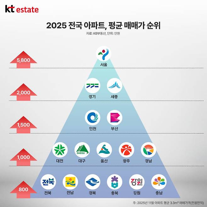 마찬가지로 2025년 11월 KB부동산의 3.3㎡당(전용면적) 아파트 평균 매매가를 기준으로 16개 시도의 해당 계급도를 만들어 보았습니다. 서울의 구별 피라미드가 6계급으로 나뉜다면, 전국은 한 단계 축소된 5계급으로 구분하는 것이 더욱 적절해 보입니다.