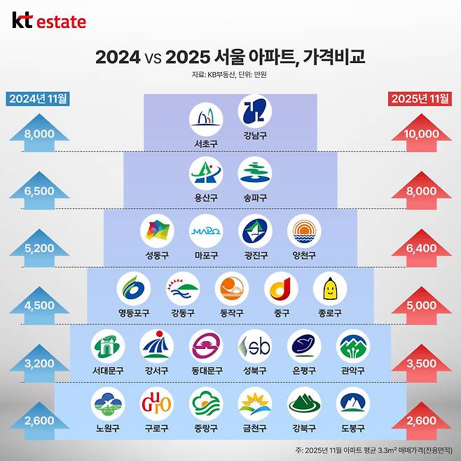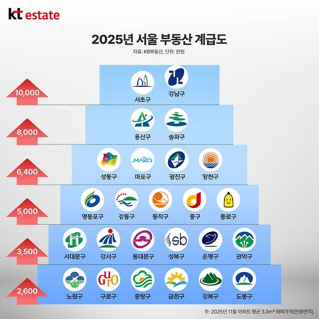 이 계급도는 KB부동산의 2024년 11월 기준 서울 아파트의 3.3㎡당 평균 매매가를 토대로 구성된 자료로, 2025년을 앞두고 ‘서울 부동산의 현주소’를 직관적으로 보여준다는 점에서 큰 관심을 받았습니다. 특히 계급을 피라미드 구조로 총 6개로 나누어 지역별 위상을 한눈에 보여준다는 점에서 공감과 논쟁을 동시에 불러일으켰습니다.