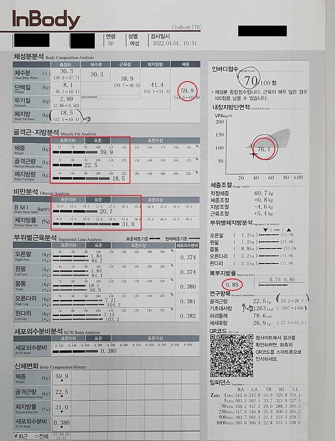 비만정도를 판단하는 BMI 지수는 20.3에서 20.7로 올랐다. 비만은 아니지만 이전보다 비만에 가까워진 것이다. 복부지방이 늘었다. 복부지방률은 출산 전 표준 범위인 0.8이었으나 출산 후 표준과 그 이상의 경계선인 0.85를 밟았다.