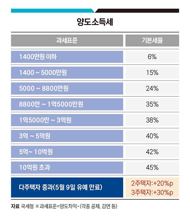 기존 다주택자에 대한 대표적인 세금 규제는 양도소득세와 종합부동산세 중과가 있다. 윤석열 정부 당시부터 유예를 반복하다 5월 9일부터 적용되는 양도소득세는 정해진 세율에 2주택자에 대해서는 20%p, 3주택자는 30%p를 적용하는 것이다.