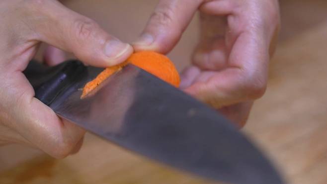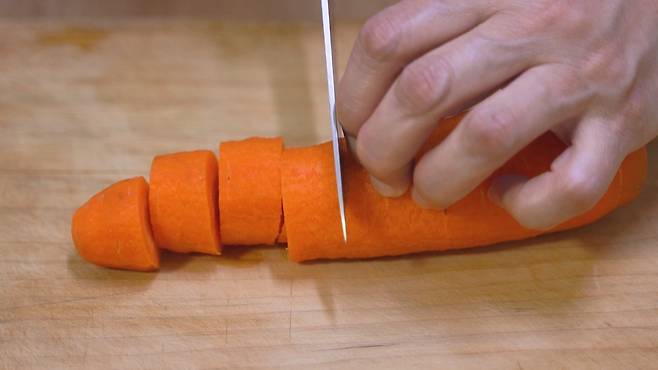 당근은 한입에 들어가기 좋은 크기로 썰은 후 모서리 부분을 깎아 주세요. 모서리 부분을 깎아야 나중에 부서지지 않아 좋아요.