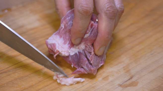 고기 부분이 두툼하다면 + 모양으로 칼집을 내어 주세요.