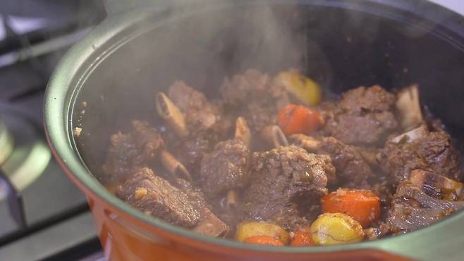 코팅이 된 두툼한 냄비에 갈비를 넣고, 뚜껑을 닫으세요. 그리고 강불에서 끓이세요.