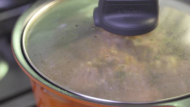 끓어오르기 시작하고 2분 정도가 지났을 때 뒤적여 주세요. 다시 뚜껑을 덮고 '중강불'에서 25분간 익히세요.