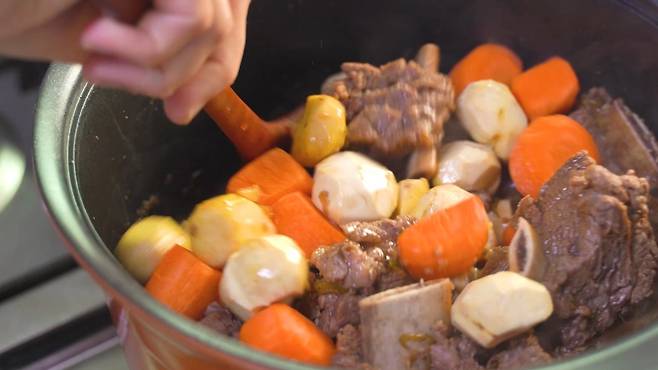 15분이 지나고 익었는지 확인 후, 불을 끄세요. 당근과 밤은 나중에 넣어 물러지지 않고 딱 알맞게 잘 익었답니다.
