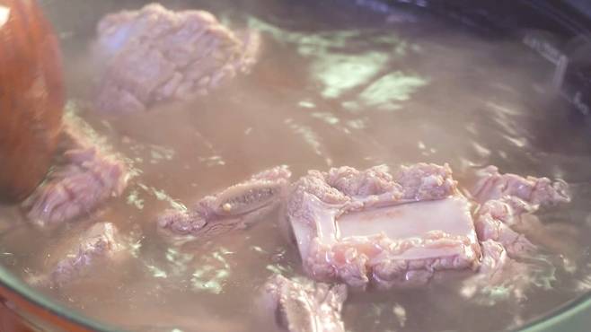 손질이 끝난 갈비는 끓는 물에 2분간 삶아 주세요. 그래야 기름기가 많이 제거되어 담백하니 좋답니다.