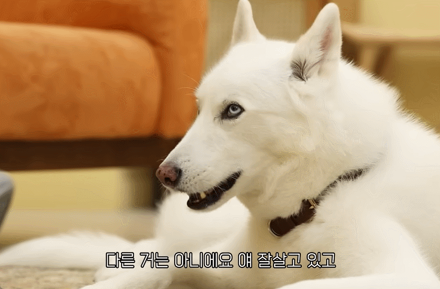 허스키랑 진돗개 혼혈이라는 진이는 파란 눈, 하얀 털, 우수한 눈빛이 매력적이에요!