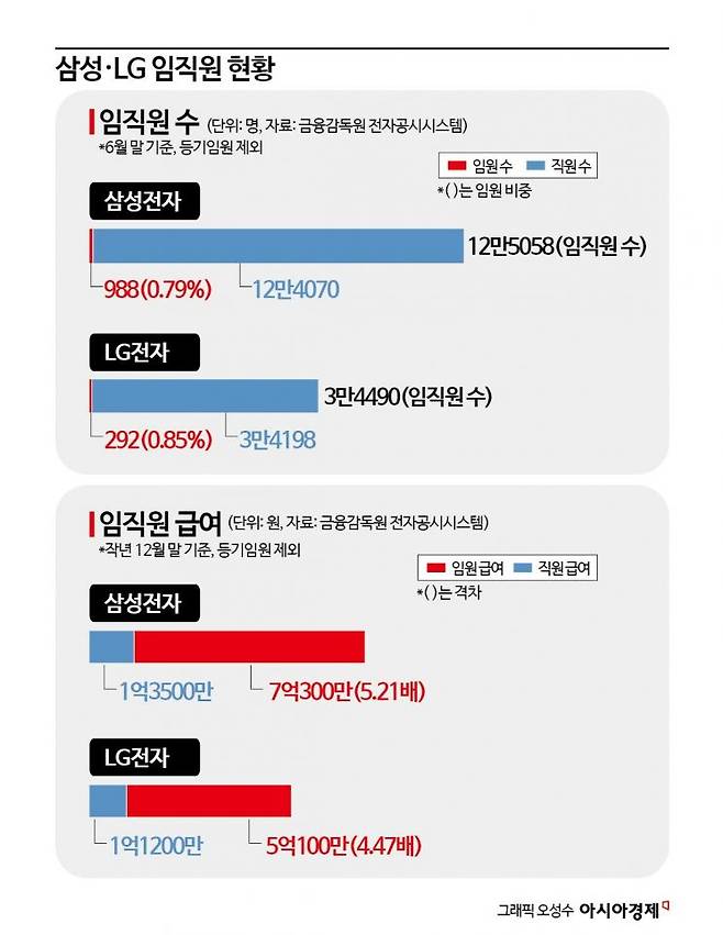 사업보고서에 기재된 삼성전자 임원 연봉은 1인당 평균 7억300만원이다. 일반 직원 평균 연봉 1억3500만원의 5.21배다. 삼성전자 임원은 부장에서 갓 승진한 상무를 시작으로 부사장, 사장, 부회장 등으로 이어진다. 과거에는 전무 직급이 있었지만 2021년부터 전무, 부사장이 부사장 하나로 통합됐다. LG전자는 임원 연봉이 1인 평균 5억100만원으로 삼성보다는 적다. 직원 평균 연봉 1억1200만원의 4.47배다.