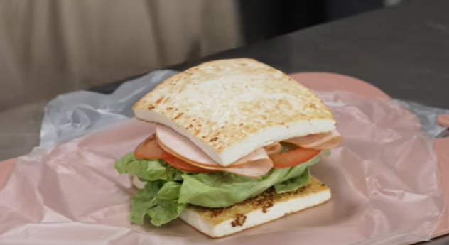 4. 양상추, 햄, 토마토, 양파, 두부 순으로 얹은 후 랩으로 감싸서 마무리 한다.