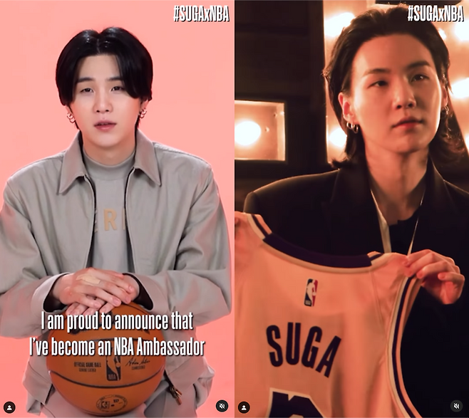 방탄소년단 슈가가 미국 프로농구 NBA의 앰버서더로 발탁되었다는 소식입니다. 6일 NBA 공식 SNS 계정에 모습을 드러낸 슈가.