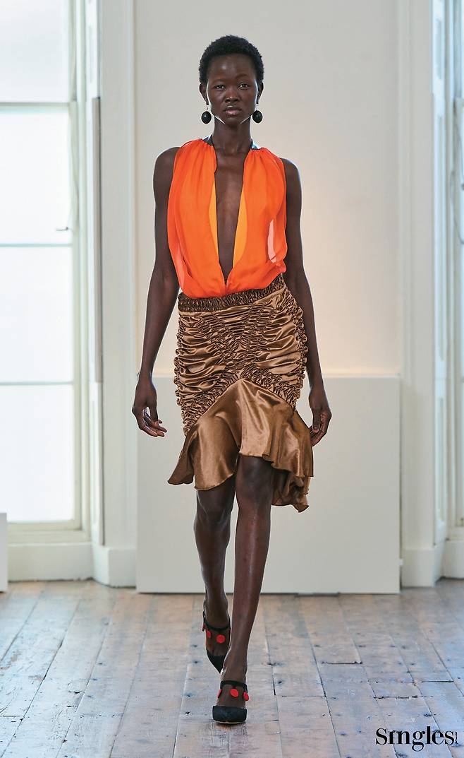 이번 시즌 네크라인은 롤러코스터처럼 쾌속으로 낙하한다. 지난겨울 턱끝까지 올라간 하이 네크라인과 달리, 풀린 날씨에 맞춰 가슴 라인이 한껏 드러난 울트라 로우 네크라인이 급부상한 것. 배꼽 아래까지 과감히 파인 마샤 포포바의 미니 드레스와 가운데 홈이 V자로 길게 빠진 페븐의 실크 톱이 이를 증명한다.