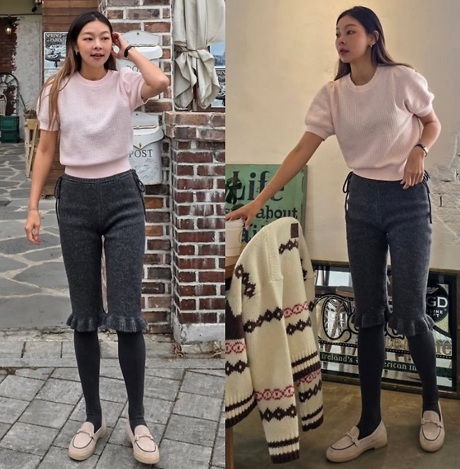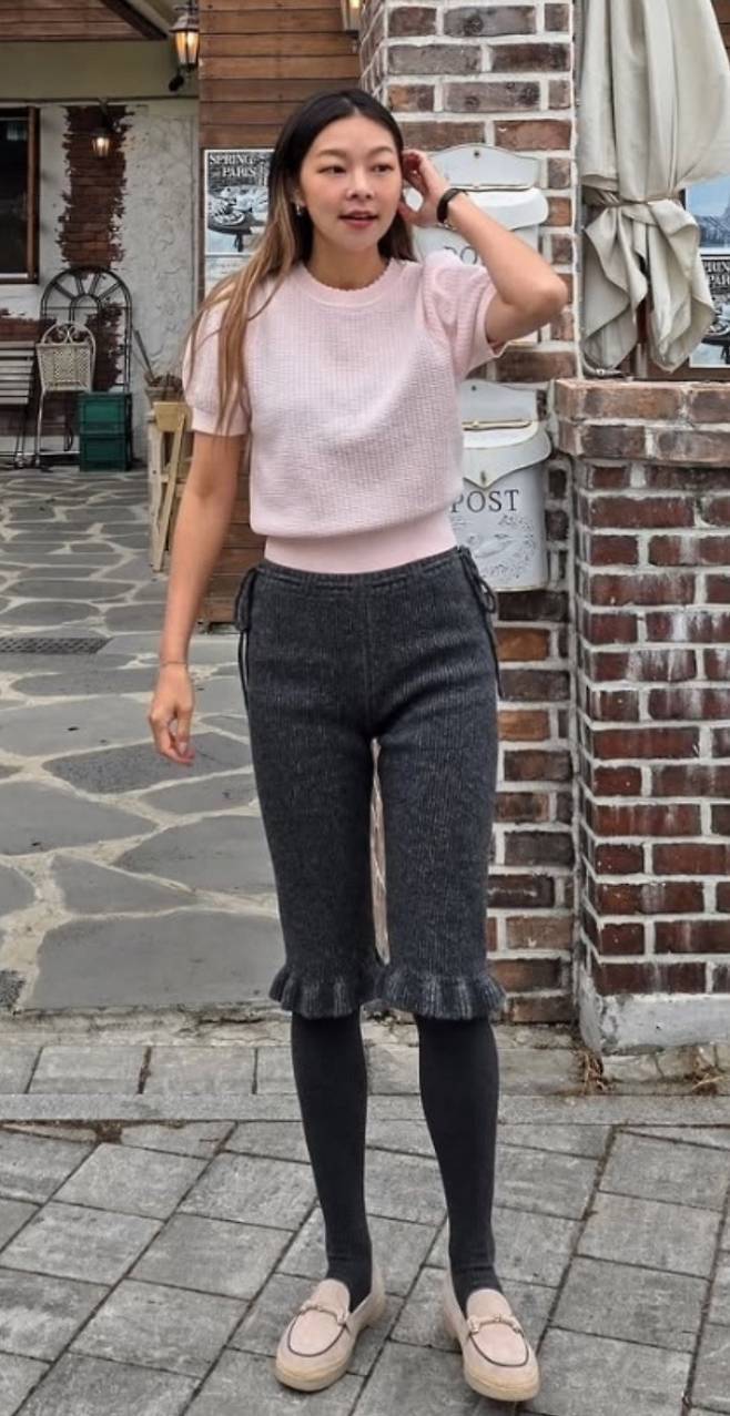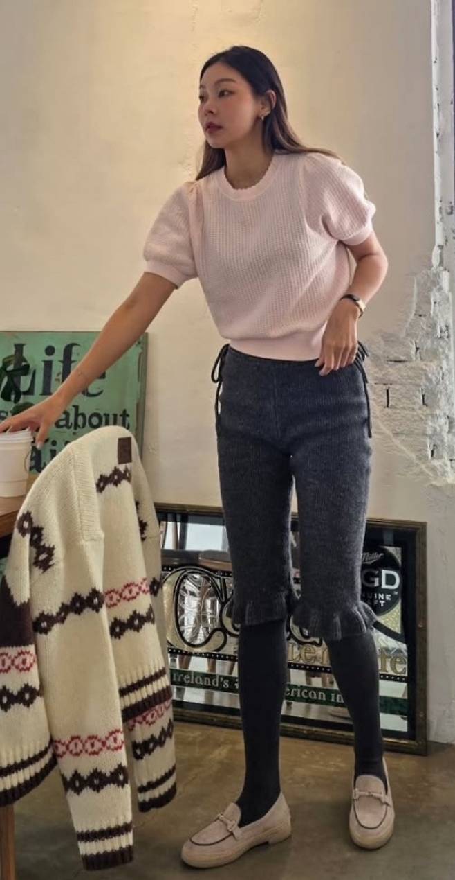 독특한 디자인의 니트 팬츠를 매치했습니다. 짙은 그레이 컬러의 니트 팬츠는 무릎 아래로 프릴 디테일이 있어 개성 있는 스타일을 완성했습니다.
