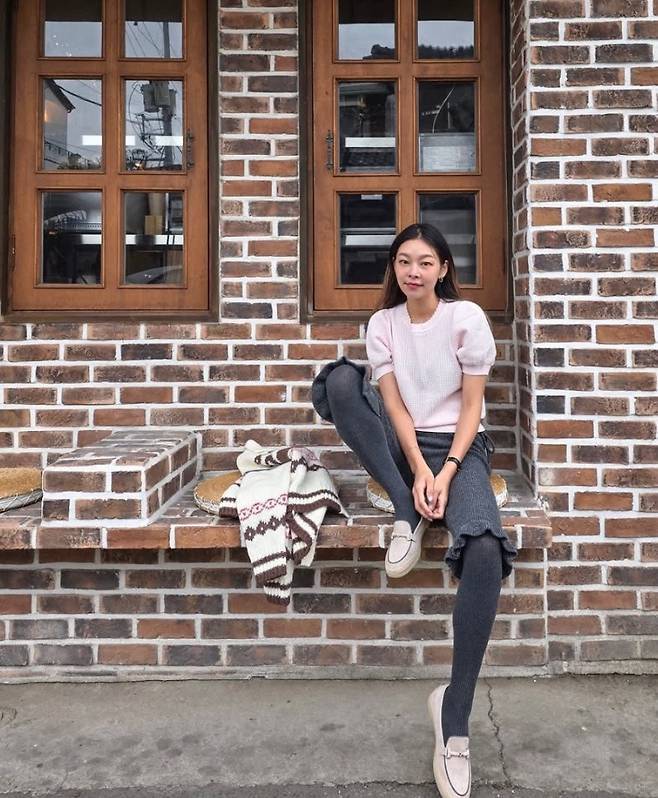 연한 핑크 컬러의 반팔 니트 톱을 착용했습니다. 짜임이 있는 니트 소재로 부드러운 분위기를 연출하며, 퍼프소매 디테일이 여성스러움을 강조했습니다.