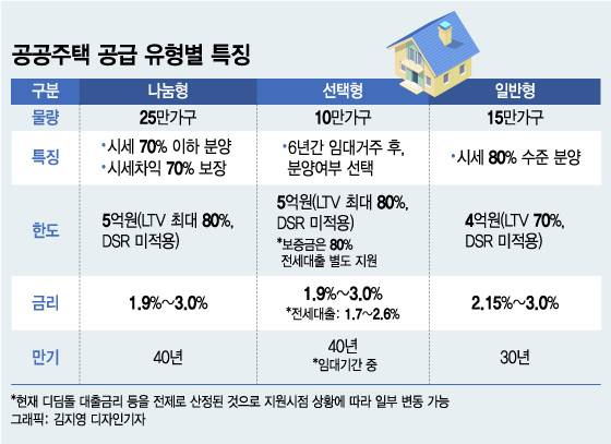 공급 유형별 전용 모기지 상품도 지원한다. 나눔형과 선택형에는 DSR를 적용하지 않고 최대 5억원(LTV한도 80%)까지 1.9%~3.0%의 저리(만기 40년) 모기지를 지원한다. 선택형의 경우 입주시엔 보증금의 80%까지 최저 1.7% 고정금리로 전용 전세대출을 지원한다. 일반형은 기존 디딤돌 대출에 청년층에 한해 대출한도를 최대 4억원까지 늘리고 우대금리를 적용한다.