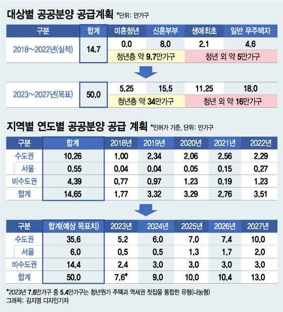 국토부는 2027년까지 시세 대비 최대 30% 저렴한 공공분양주택 50만호를 공급하기로 했다. 지난 정부에선 5년간 공공분양이 14만7000호에 그쳤다. 특히 미혼 청년 특별공급을 신설해 5만2500호를 공급하고 신혼부부에 15만5000호를 배정하는 등 청년층 몫이 34만호에 달한다. 전체 공공분양 물량의 68%가 2030 청년세대에게 공급되는 것.